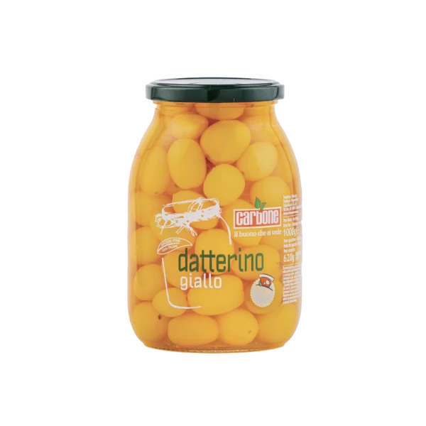 Contrairement à ce que l'on pourrait croire, la tomate datterino jaune est l'ancêtre de la tomate que nous connaissons aujourd'hui. Les premiers cultivateurs de tomates étaient les Amérindiens, qui en consommaient abondamment et attribuaient à ses baies jaunes des vertus aphrodisiaques. La plante fut ensuite exportée en Espagne pour un usage ornemental, mais c'est précisément de là que les Italiens ont emprunté le nom de « pomme d'or » au fruit que l'on trouve aujourd'hui sur nos tables. La tomate datterino jaune a une saveur sucrée et se caractérise par une absence totale d'acidité. À la récolte, elle se présente en grappes régulières de 14 à 16 fruits, de forme cylindrique, irrégulière et uniforme. Elle est riche en substances au fort pouvoir antioxydant, capables de neutraliser les radicaux libres. Elle contient également des vitamines C, A et B. C'est précisément parce qu'elle est dépourvue d'acidité que, contrairement à la tomate classique, elle est largement utilisée dans les recettes à base de poisson et de fruits de mer, ainsi que pour garnir les pizzas.