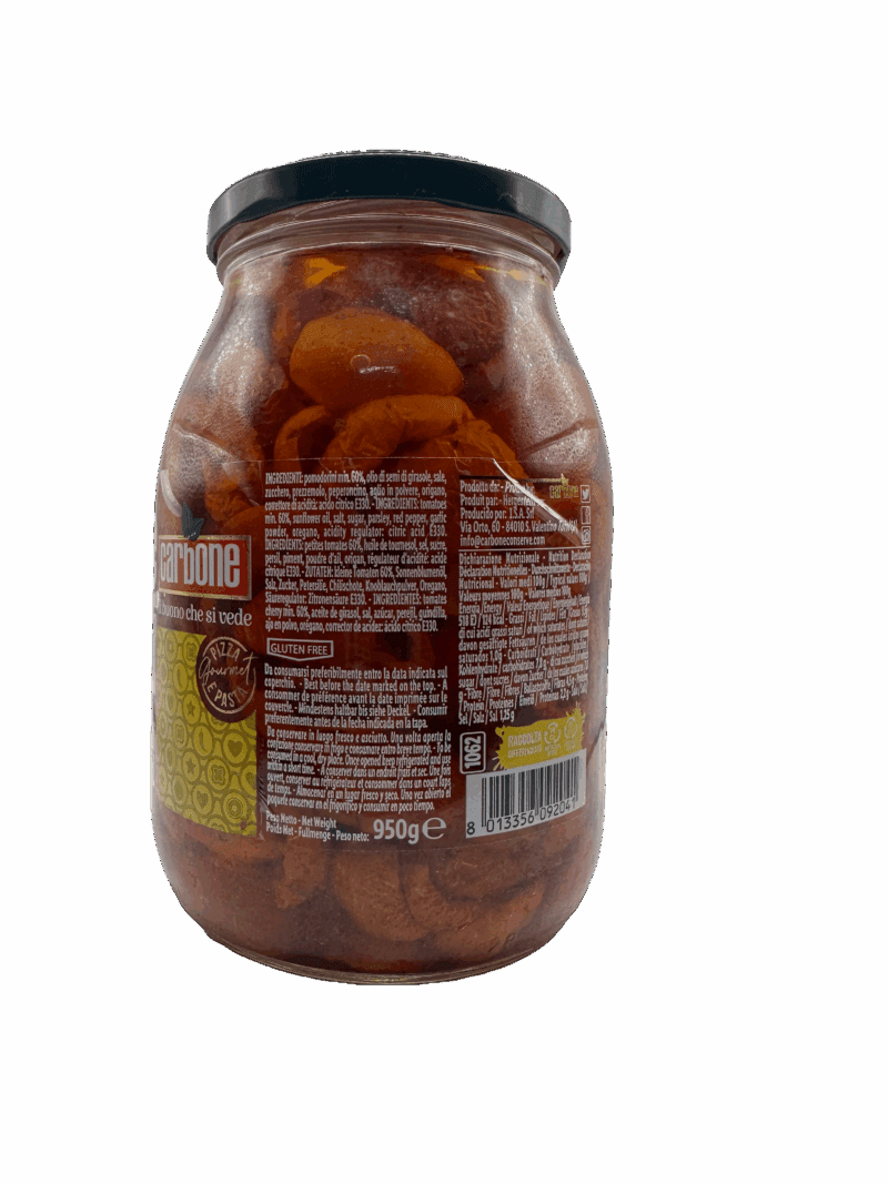 Tomates cerises coupées en deux, légèrement séchées et aérées pour maximiser le parfum et la douceur des tomates cerises sur pied. Assaisonnées d'huile, de sel, de persil, de piment, d'ail et d'un peu d'origan, elles sont idéales sur une pizza.